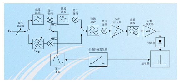 大家使用的频谱分析仪基本都是超外差式的频谱分析仪,今天我们来简单介绍一下它的工作原理。超外差式频谱分析仪的简化原理框图如下: