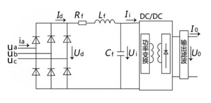 直流充电桩电气系统三相电网输入交流电,经过三相桥式不可控整流电路整流变成直流电,滤波后提供给高频DC-DC功率变换器,功率变换器经过直直变换输出需要的直流,再次滤波后为电动汽车动力电池充电。如图3所示。