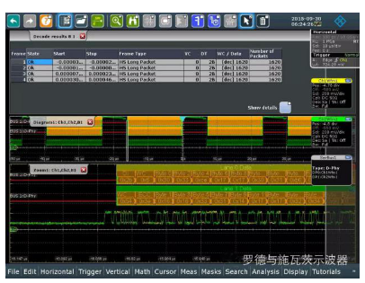 同时,解码的内容与模拟信号时间相关,帮助用户方便地识别由信号完整性问题带来的错误。另外,列表显示的协议内容也支持强大的协议搜索和导航功能,简化了用户的调试过程,并使用户对特定的单独像素进行验证和相关分析成为可能。