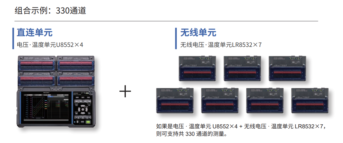 如果是电压/温度单元U8552× 4台+无线电压/温度单元LR8532× 7台,则可以实现总共330通道的测量。