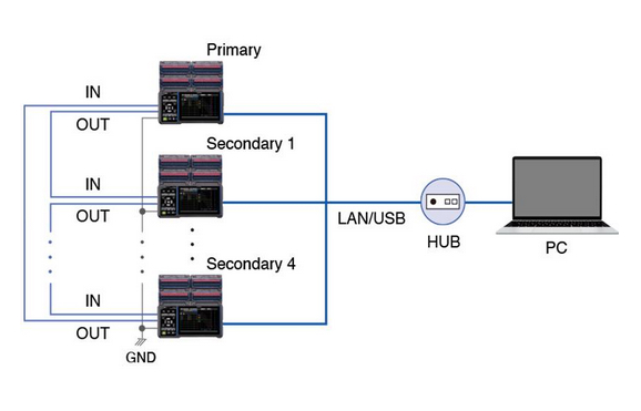 连接多个LR8450外部同步端子( SYNC.IN、SYNC.OUT )后,最多可进行5台(模拟600 ch )的同步采样测量。